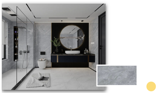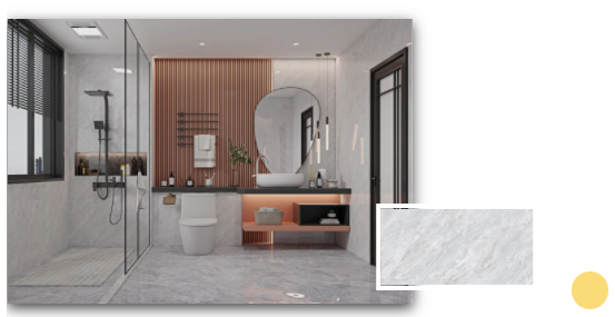 安道爾橙格柵背景+水云灰通體瓷拋石中板的溫暖搭配,令一個舒適的浴室環(huán)境躍然而上。扇形的鏡面設(shè)計配以及暖色調(diào)條形燈,不僅契合當下年輕人的空間審美,更煥發(fā)出不一樣的青春活力。