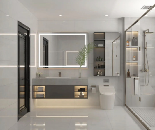 400×800mm戛納灰搭配白色衛(wèi)浴潔具,方寸間彌漫著輕靈通透的視覺效果,木色元素的融入,自帶溫暖治愈的格調(diào),為空間塑造柔美輕盈的印象。