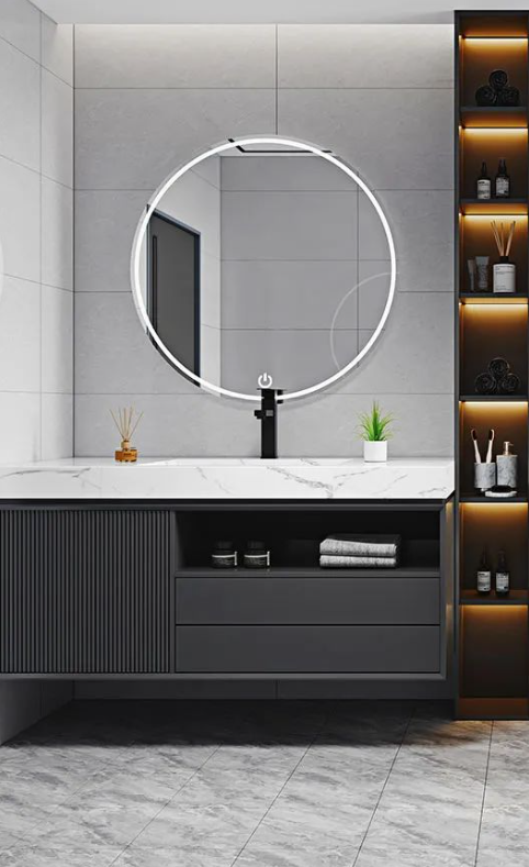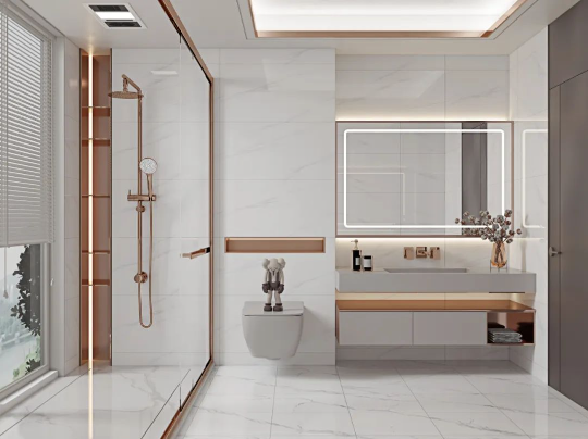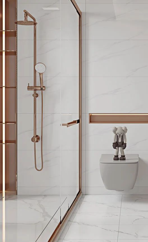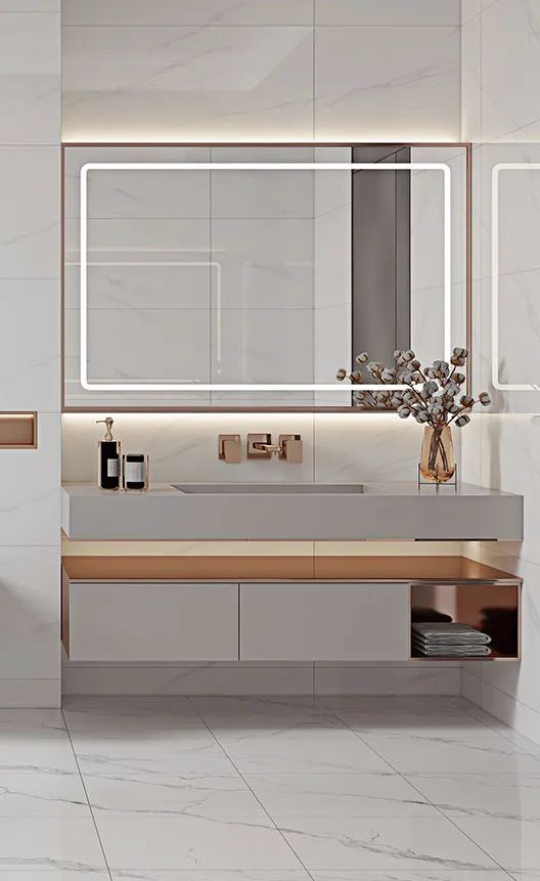 將現(xiàn)代工藝與自然的真實(shí)質(zhì)感糅合,「哥倫比亞白」純凈素雅的磚面靈動(dòng)自然,在柔和光線下帶來波光粼粼的美感,結(jié)合玫瑰金打造的典雅洗浴柜,煥發(fā)出非凡的氣質(zhì)與底蘊(yùn)。