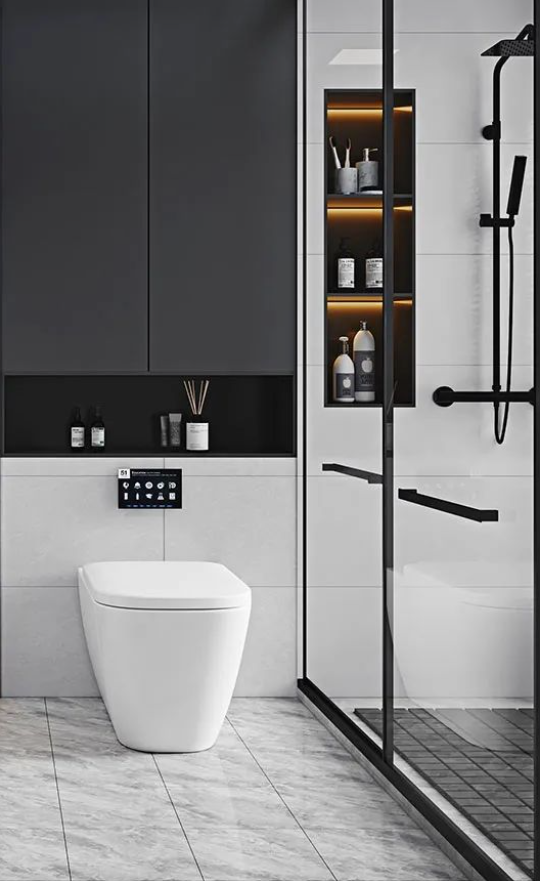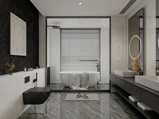 「勞特布」磚面肌理的深淺變化,搭配黑色洗浴柜與白色衛(wèi)浴,隨意散落的石紋宛如一幅巨大的自然畫卷流淌于空間之中,把浴室變成了一個(gè)高雅的藝術(shù)世界,頗有大氣磅礴之勢(shì)。