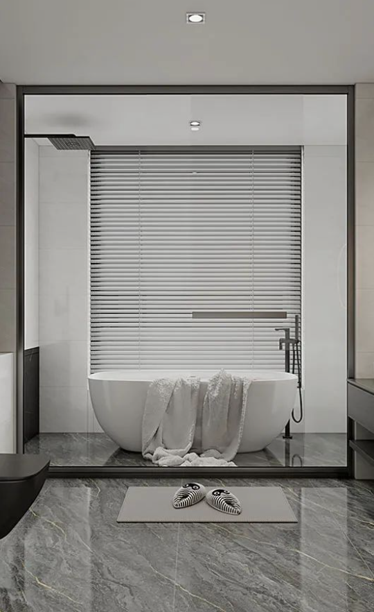 素雅的灰色調(diào)下,「泊桑灰」傳遞著清新淡雅的氣息,無限連紋的隨意組合看似平凡,卻在平靜的空間中體現(xiàn)超凡脫俗的靈魂之美。天然石材的肌理質(zhì)感,細(xì)膩而溫婉,營(yíng)造出悠閑沐浴時(shí)光。