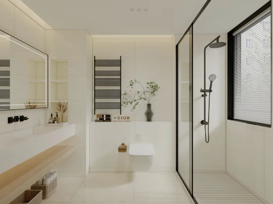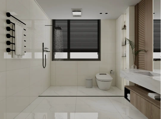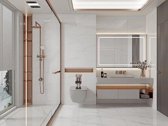 哥倫比亞白通體自帶的爽朗現(xiàn)代感,結(jié)合大理石紋進(jìn)行通鋪,讓衛(wèi)浴間格外明亮之余,無(wú)限連紋拉伸空間視覺(jué)比例,給人一種賞心悅目的天然感受。