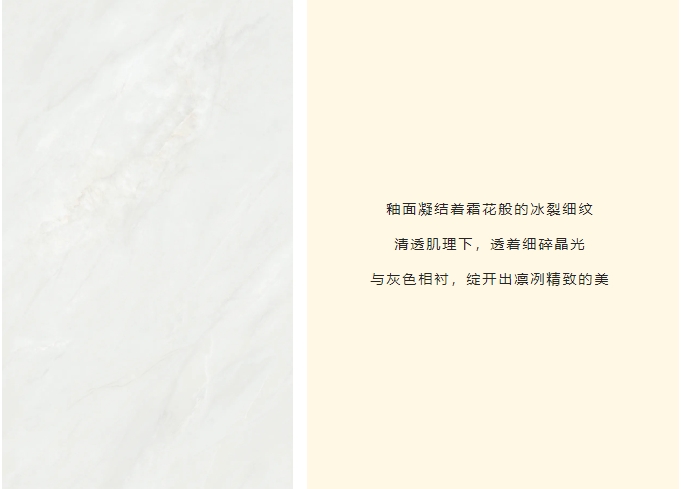 突破傳統瓷磚的二維表達,以三層納米釉料疊加工藝,構筑立體光感矩陣,經1280度高溫淬煉,凝結98度水晶光感,讓釉面在歲月侵蝕中始終葆有初生般的透潤光澤。